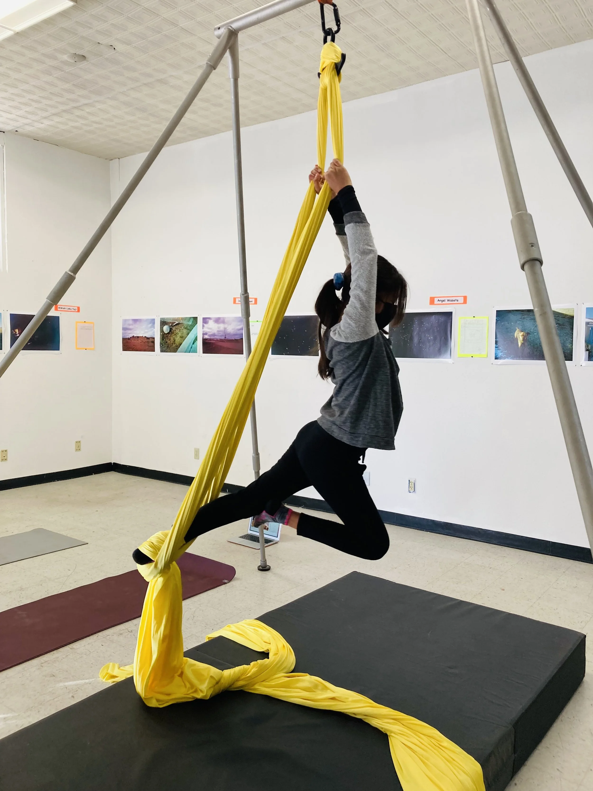 youth aerialist Jade B. on the aerial silk at ART123 in downtown Gallup, New Mexico
