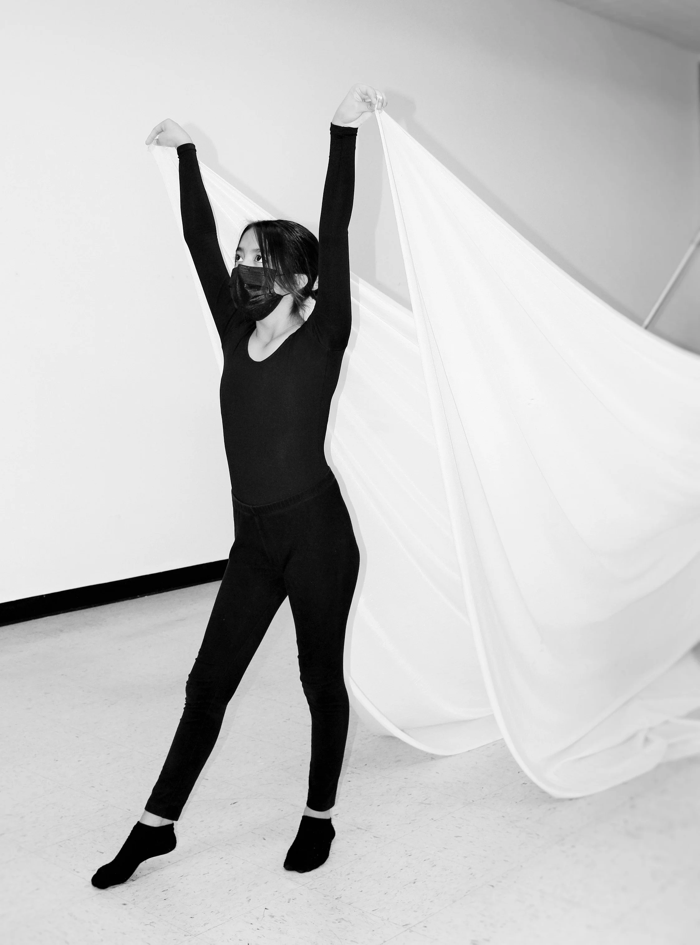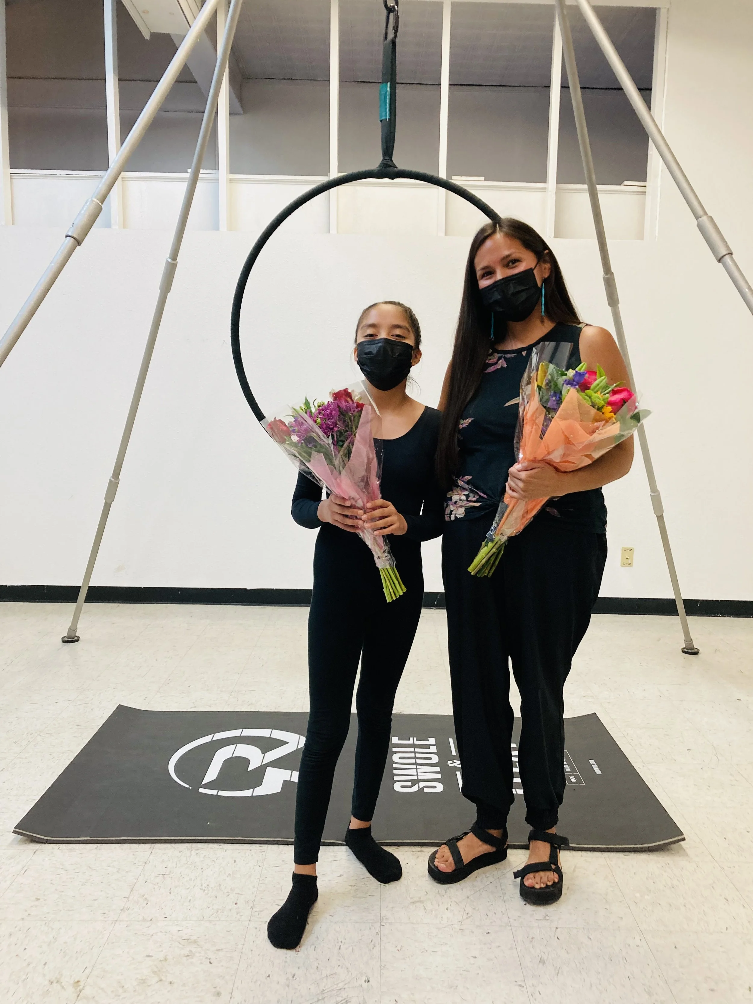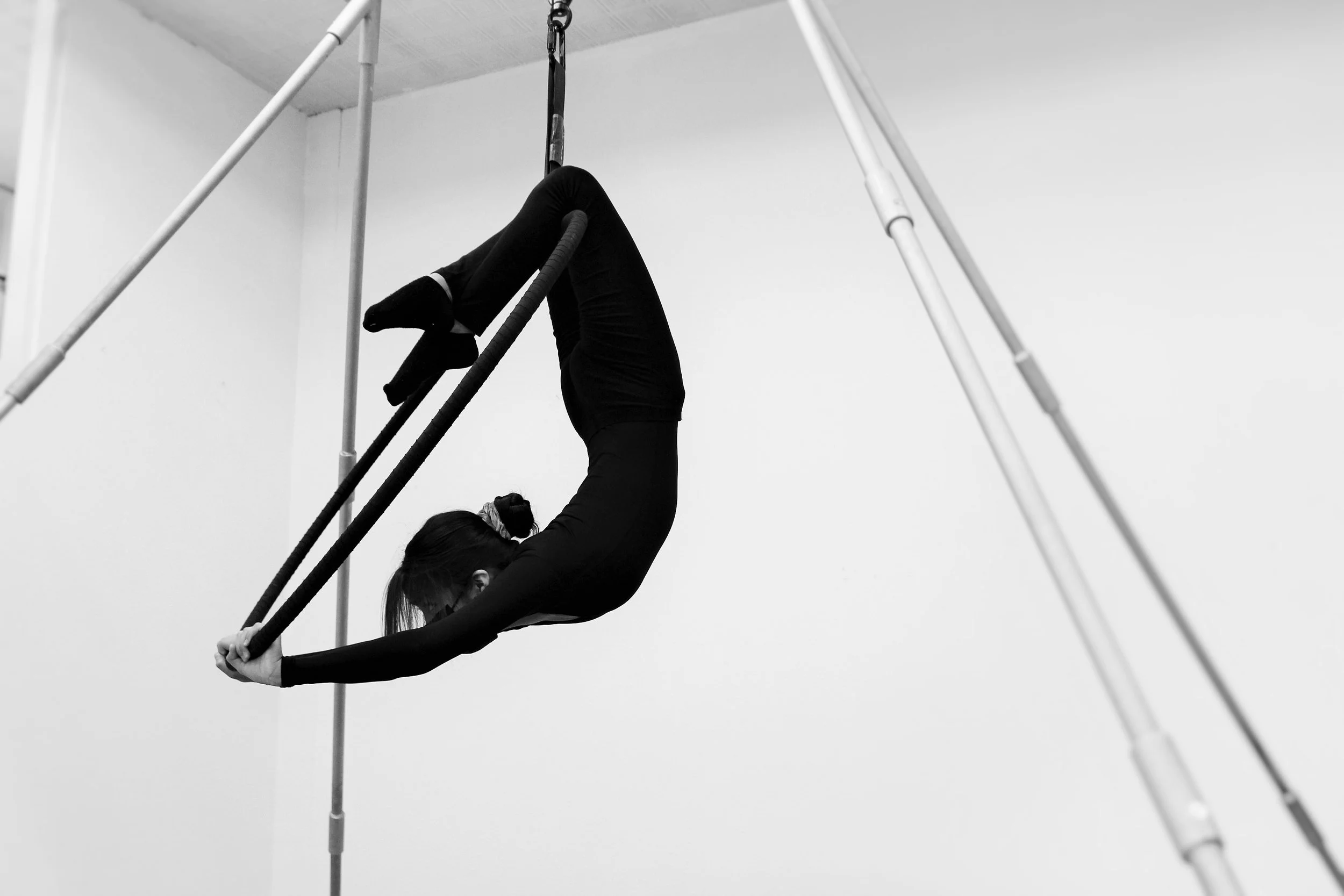 above black and white images: Jade B. pictured during the completion of her aerial art 8-week intensive. hosted by Gallup Arts at ART123 in downtown Gallup, New Mexico.